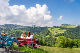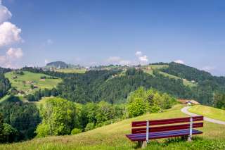 Velofahrer aufgepasst: auf dem Veloweg in Rehetobel erwartet einen eine rasante Abfahrt mit traumhaften Ausblicken. Die Lobenschwendistrasse hinab tut sich die Aussicht auf St.Galler und Appenzeller Berg- und Waldgebiete auf. Ein Bänkli lädt ein, die Momente während einer Verschnaufpause zu geniesse.