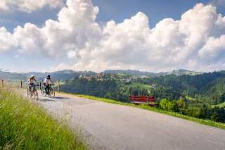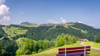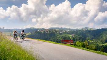 Vom Aussichtspunkt Rehetobel geniessen Velofahrer und Spaziergänger einen fantastischen Ausblick auf St.Galler und Appenzeller Berg- und Waldgebiete.