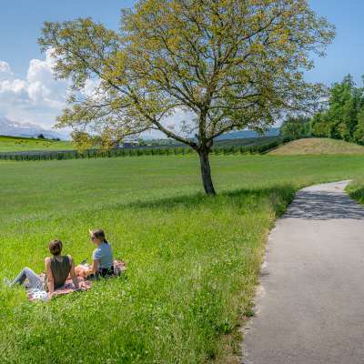 Umgeben von blühenden Obstbäumen und leuchtenden Blumenfeldern befindet man sich auf dem Ruggisberg im Apfelparadis. Hier soll die Picknickdecke ausgeweitet und eine Verschnaufpause von der Velotour genossen werden.