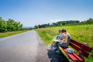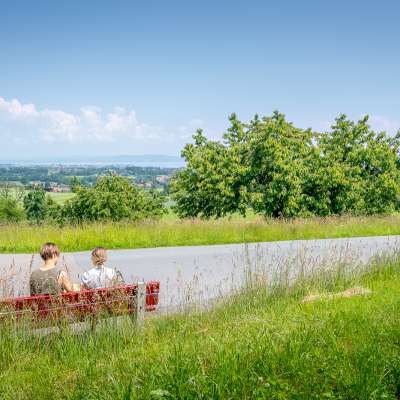 Oberhalb von Roggwil bei Watt befindet sich der Aussichtspunkt Rüti. Von hier aus haben Velofahrer und Spaziergänger einen fantastischen Ausblick auf die umliegende Region und den Bodensee. Und ein Bänkli lädt für eine gemütliche Verschnaufpause ein.