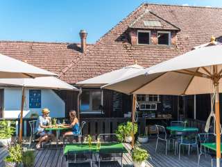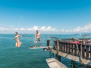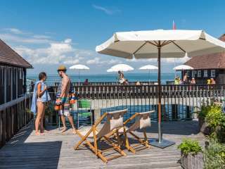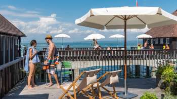 Die Badhütte aus dem Jahr 1924 ist das einzig verbliebene Bauwerk seiner Art am Schweizer Bodenseeufer. Die hölzerne Badeanstalt steht auf Pfeilern im See und ist nur über eine Brücke vom Ufer her zu erreichen. Sie ist nicht nur eine Touristenattraktion, sondern auch ein wichtiger Treffpunkt für die einheimische Bevölkerung. Das Restaurant mit Plätzen im lauschigen Innenhof und auf der Zugangsbrücke verwöhnt nicht nur die Badegäste sondern auch Spaziergänger mit frischen Getränken, Kaffee und Kuchen.