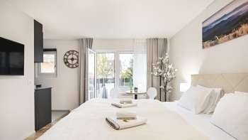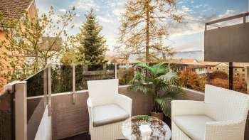 In der hellen und mondän eingerichteten Wohnung schlafen die Gäste komfortabel in einem Kingsize-Boxspringbett (180x200cm). Auf dem Balkon lassen sich schöne Sonnenstunden mit Blick auf das voralpine Panorama geniessen.