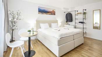 Eine Garderobe und Schrank bieten viel Platz für Kleider und Gepäck. Für die Unterhaltung an ruhigeren Tagen steht nicht nur kostenloses WLAN, sondern auch ein neuer Smart-TV samt Netflix-Konto und ein SunriseTV-Abo zur Verfügung.