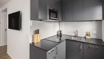 Eine kleine, aber feine Kochecke, ausgestattet mit Herd, Geschirrspüler, Gefrierfach, Mikrowelle, Kaffeemaschine, Wasserkocher, Tellern, Gläsern und Besteck, lädt dazu ein, Speisen zu kochen, die auf dem kleinen Esstisch, im hellen und gemütlichem Ambiente, genossen werden können.
