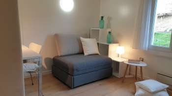 Das Bad beinhaltet Badewanne, separate Dusche, Lavabo, Handtuchwärmer, Fön und Frottéewäsche. Das WC ist separat.