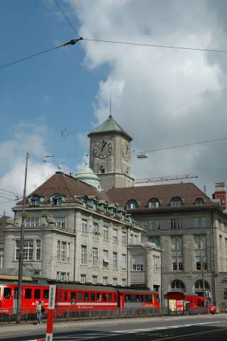 Die Inspiration der Architekten für die Grundrisse mit vergleichbaren Zwischenräumen stammte von der «Piazza delle Erbe» in Verona (Italien): Die Eingangshalle des damals neuen Hauptbahnhofs wird von zwei soliden Turmsockeln flankiert. Die vierstöckige Sandsteinfassade ist umgeben von kräftigen Pilastern, welche bis zum Dachvorsprung reichen. Auch die Hauptpost erhielt einen Neubau – mit dem mächtigen Turm. Die monumentale Jugendstil-Schalterhalle mit Deckenmalereien, Mosaiken und Skulpturen ist noch immer im Originalzustand erhalten. Die beiden viergeschossigen Bauten mit steilen Walmdächern dominieren den Bahnhofplatz.
