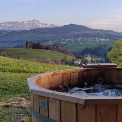 Wer ausspannen und sich etwas Gutes tun möchte, verbringt wohlige Stunden im Hotpot und geniesst dabei die freie Sicht auf den Alpstein.