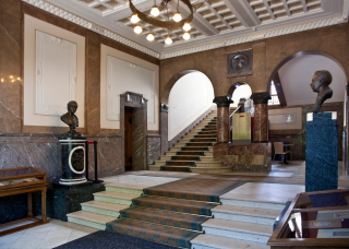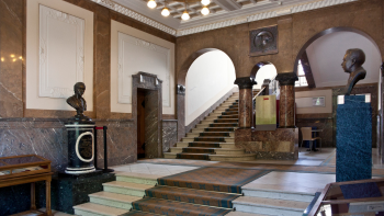 Im Inneren des Gebäudes – in der Eingangshalle und in den Gängen – fallen die vielen schweren und edlen Materialien (Kalk-, Sand- und Schiefersteine und allerlei Marmorsorten) auf. Ein Sechstel der Baukosten soll auf Steinhauerarbeiten entfallen sein! Farbige Marmortäfelung, Jugendstil-Stukkaturen, Kassettendecke, Kunstverglasung und -schmiedearbeiten: Das Gebäude ist innen und aussen weitgehend im Originalzustand erhalten. Nach Expertenmeinung: der schönste Schweizer Bibliotheks- und Archivbau der Jahrhundertwende.