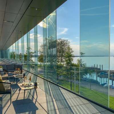 Ein offener Lounge-Bereich mit Seeblick lädt im ersten Obergeschoss des Würth Haus Rorschach zum Geniessen und Verweilen ein.