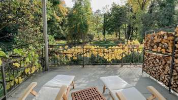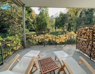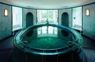 Das historische "Türkise Bad" ist ein 5,5 m grosses Bade-Oval aus dem Jahr 1928. Hier lässt es sich nach einem Saunagang vollkommen erholen. Auch die Liegeterrasse mit Blick auf die Baumkronen des Schlossparks lädt zur Entspannung ein.