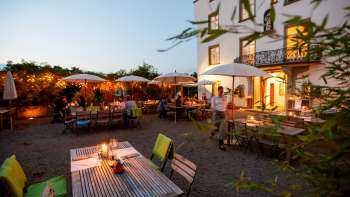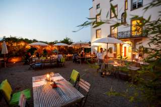 Ein Highlight des Bio-Restaurants ist die einladende Gartenterrasse mit stimmungsvollem Blick auf den Englischen Park und den Bodensee.