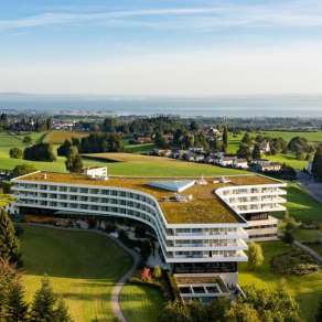 An sonnigen Tagen ist die Seeblick-Terrasse geöffnet - mit dem Blick auf den privaten Oberwaid Park und den Bodensee.