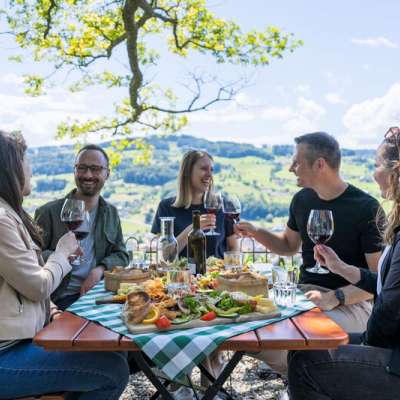 Im Anschluss begibst du dich auf einen Spaziergang durch die Rebberge um nach dem Aufstieg eine wohlverdiente Brettljause (Fleisch- und Käseplättli) bei Daniela Brugger im Ausflugsziel Steiniger Tisch zu geniessen. Diese hat ab 11.30 Uhr geöffnet. Bitte telefonisch unter 071 888 12 05 im Ausflugsziel Steiniger Tisch anmelden, wenn Ihr am Weingut Steinig Tisch startet.