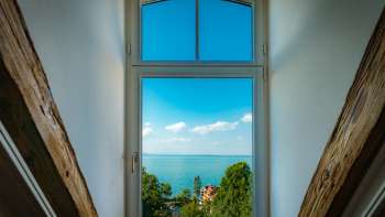 Whether from the castle park, the spacious terraces, or the 25 stylishly furnished single and double rooms, which are equipped with high-quality natural materials and comfortable natural mattresses: the view of Lake Constance and the surrounding nature is incomparable and offers the ideal backdrop for a relaxing stay.